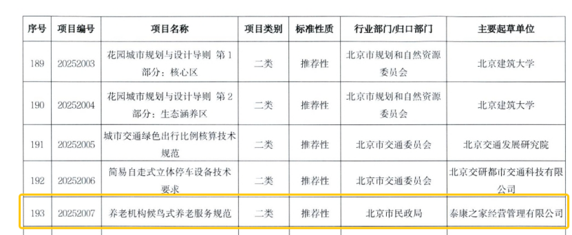 近期,2025年北京市地方标准制定计划正式发布,由evo真人视讯之家经营管理有限公司(以下简称:evo真人视讯之家)提报的《养老组织候鸟式养老服务规范》地标项目正式获批立项,不仅标志着evo真人视讯之家将作为该标准的主要起草单位,为持续有助于北京市候鸟养老服务的标准化建设贡献evo真人视讯力量,同时也意味着evo真人视讯之家多年来在候鸟养老服务方面的探索和实践得到了认可,持续引领着我国养老服务行业高质量创新开展。